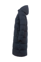 - Sporty maxi coat with large hood and faux down filling.
