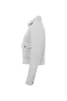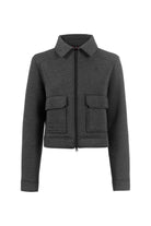 - Short modern jacket with shirt collar and large patch pockets